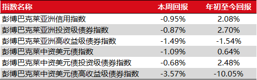 上週,中資美元債累計淨發行持續下降;出於對個別地產主體債務違約的擔憂,高收益中資美元債本週下跌幅度較大。二級市場整體表現:彭博巴克萊亞洲信用指數全週回報為-0.95%,彭博巴克萊亞洲投資級債券指數回報為-0.87%,彭博巴克萊亞洲高收益級債券指數回報為-1.49 %。彭博巴克萊中資美元債指數全週回報為-1.09%,彭博巴克萊中資美元債投資級債券指數回報為-0.68%,彭博巴克萊中資美元債高收益級債券指數回報為-3.57%。